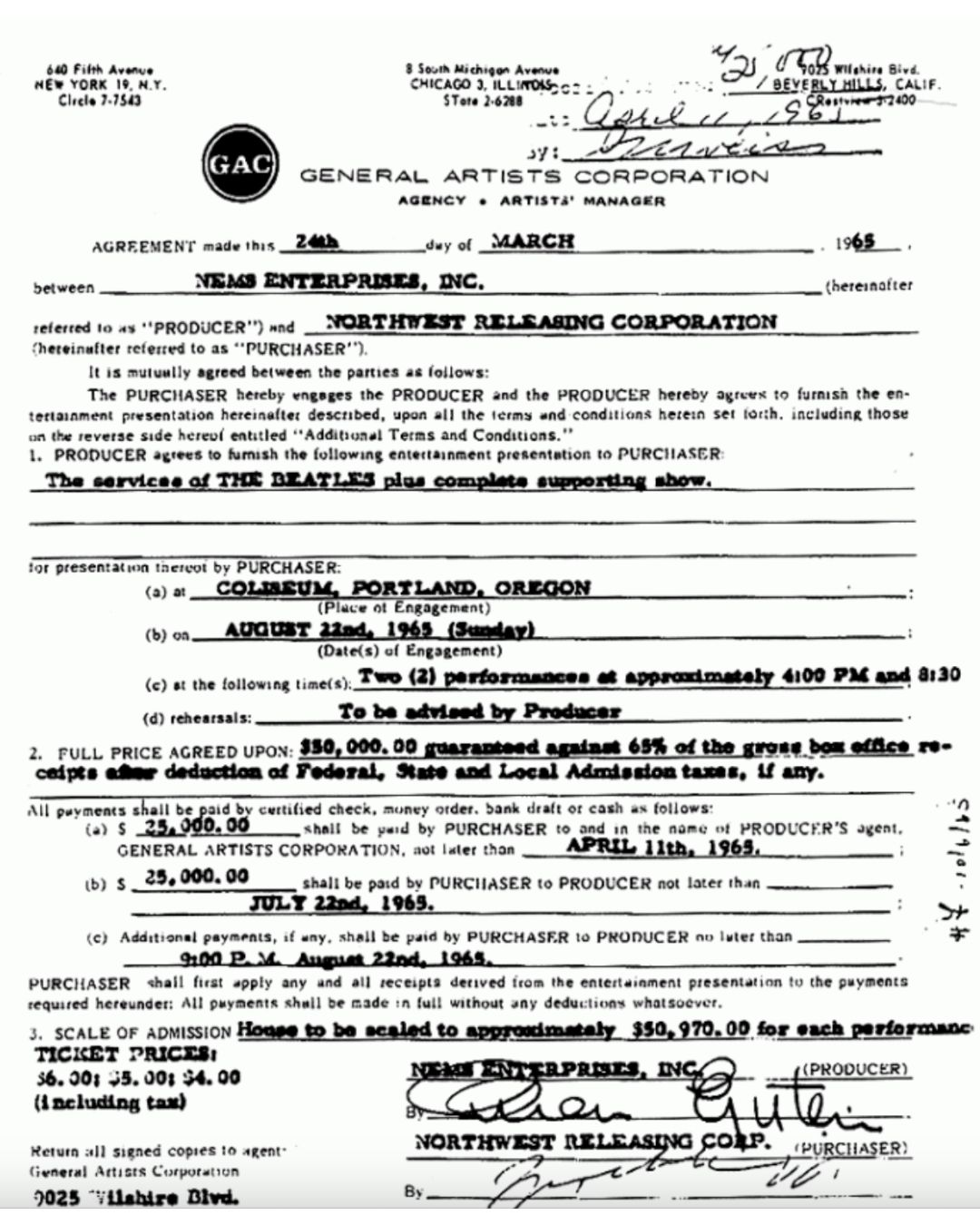 TIMES HAVE CHANGED! Check out this $50k offer for the Beatles to play 2 shows in 1965. $4-$6 tix sound pretty nice.