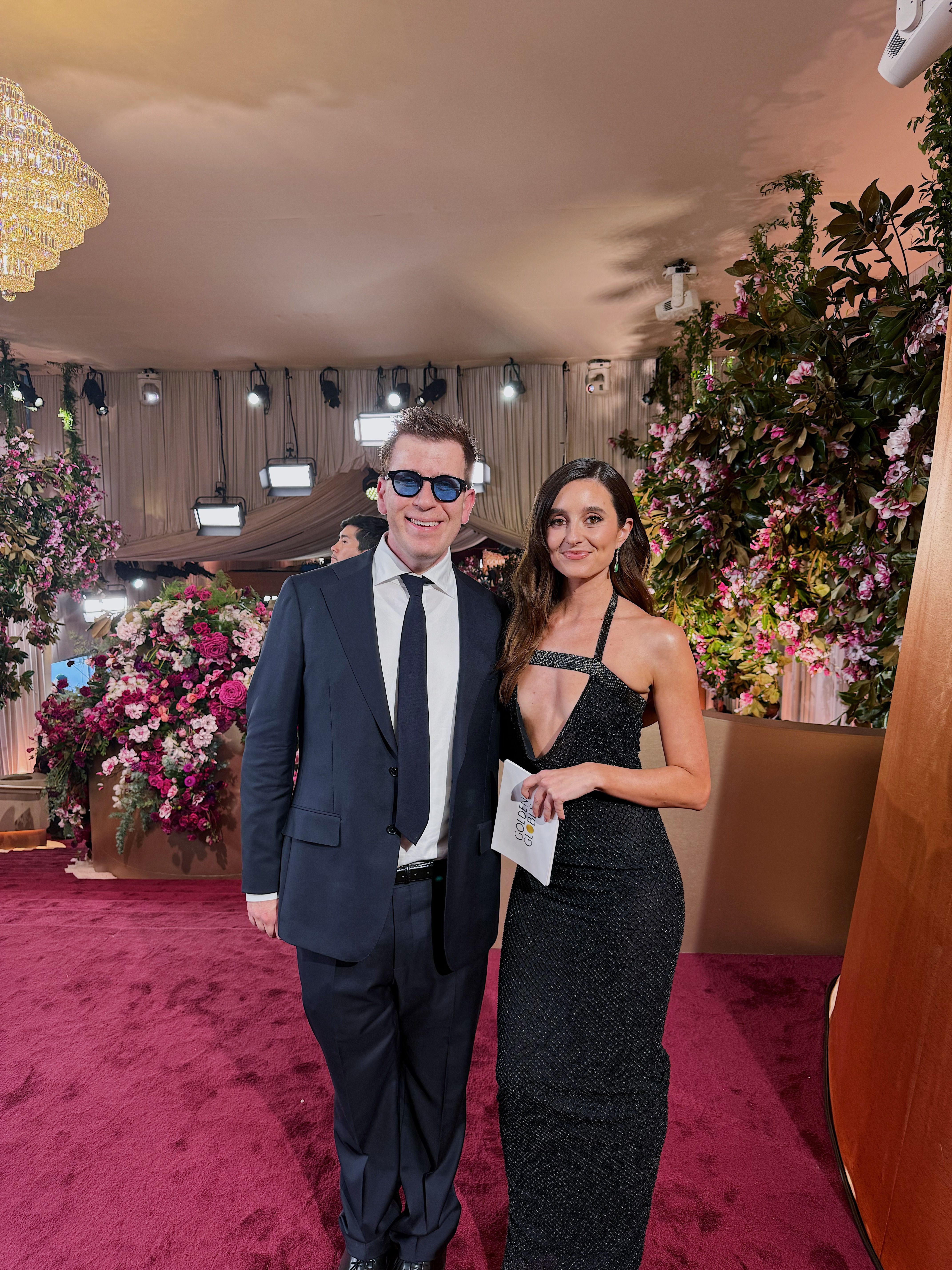 The 2023 Golden Globes was also the first time we collaborated with comedian Matt Friend, who did impressions of celebrities while he was conducting interviews on the carpet. Austin Butler was on the awards circuit for Elvis that year and happened to recognize Matt from social media. Austin wasn’t doing any interviews on the carpet but saw Matt and had to stop by to talk with him and hear his Elvis Presley impression.