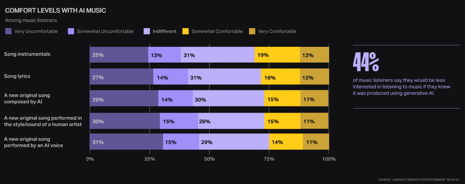 44% of listeners said that they would be less interested in listening to music if they knew it was made with the help of generative AI.