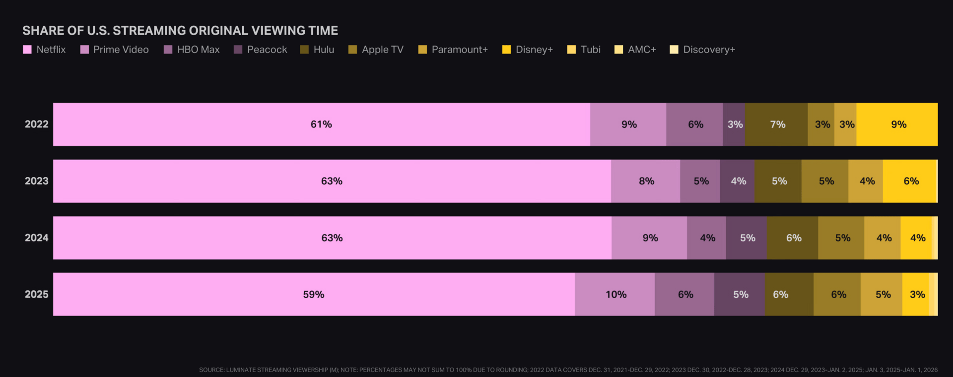 2) Netflix is dominated viewing time in the U.S. in 2025 for original content, with Amazon Prime and HBO Max rounding out the top 3.