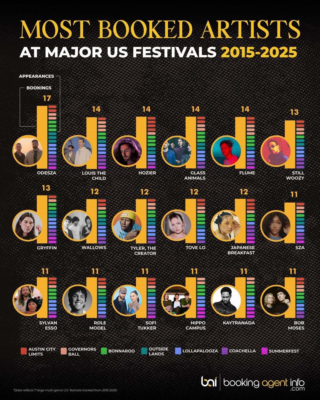 3) What Artist has gotten booked on the most major U.S. festivals the last decade?
