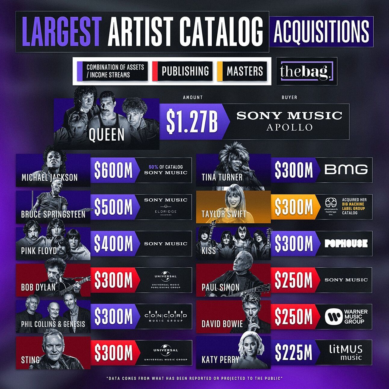 Queen – $1.27 billion, purchased by Sony Music with financing from Apollo Group