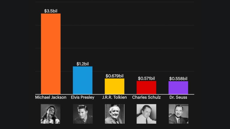Michael Jackson’s estate leads the way with $3.5B, with Elvis and J. R. R. Tolkien rounding out the top 3 earners. That number will probably rise as MJ’s biopic, out in April of ‘26, just released their first trailer, hitting 30M views in first 6 hours.